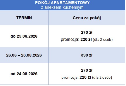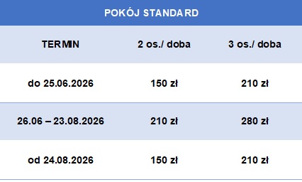 Sezon 2026 – ceny w przeliczeniu za pokój, za dobę: